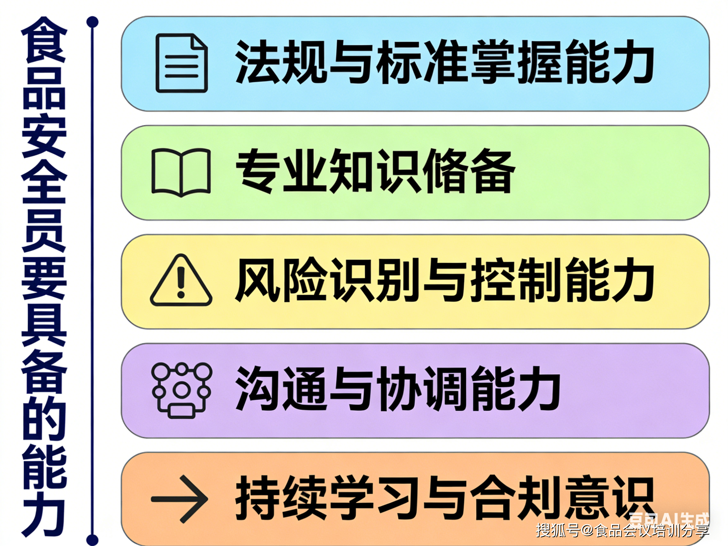 全面控制《中华人平易近国食物平安法》《食物平安法实施条例》《食物出产运营监视查抄办理法子》等焦点律例,明白企业的义务(如 “全过程节制”“从体义务”)及违法后果(罚款、吊销许可、刑事义务等)。熟练使用食物平安国度尺度(GB 系列),包罗原料平安尺度(如 GB 2762 污染物限量、GB 2763 农药残留)、出产卫生尺度(如 GB 14881 食物出产通用卫生规范)、查验方式尺度(如 GB 4789 微生物查验)等,确保出产全流程合适尺度要求。控制食物微生物学(如致病菌污染风险、菌落总数节制)、食物化学(如沉金属、添加剂、食物工艺学(如热加工、冷藏、包拆等环节的平安节制点)等焦点学问,能识别分歧食物品类(如生鲜、罐头、烘焙)的特有风险。熟悉 HACCP(风险阐发取环节节制点)、ISO 22000 食物平安办理系统、SSOP(卫生尺度操做法式)等系统的焦点逻辑,能理解 “风险防止”“过程节制” 而非 “结尾查验” 的办理。能通过原料验收、出产过程放哨、成品查验等环节,识别生物风险(如沙门氏菌、霉菌)、化学风险(如不法添加剂、农残超标)、物理风险(如金属异物、玻璃碎片)及工艺风险(如杀菌不完全、冷链断链)。能针对识此外风险采纳立即办法(如暂停出产、隔离问题原料),并鞭策落实改正防止办法(如优化清洗流程、升级检测频次)。能取出产、采购、研发、发卖等部分无效对接(如向采购部分明白原料验收尺度,向出产部分强调环节节制点操做规范),确保食物平安要求贯穿全链条。能共同监管部分的查抄(供给记实、注释流程),取供应商沟通质量要求,或向消费者解答根本食物平安问题。关心律例取尺度更新(如国度卫健委发布的新国标、市场监管总局的监管动态),自动加入行业培训(如 HACCP 内审员、食物平安办理员证书培训),确保办理方式取行业要求同步。具备 “零” 的合规认识,明白食物安满是企业底线,杜绝 “侥幸心理” 或 “成本优先” 的违规操做。感乐趣的记得留言哦。食物会议培训核心,分享食物行业会议培训动态,充实满脚您的进修需求。前往搜狐,查看更多。